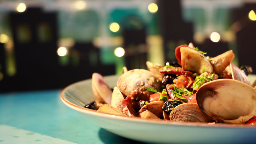 Clam, Risotto, Potatoes, and Salmon