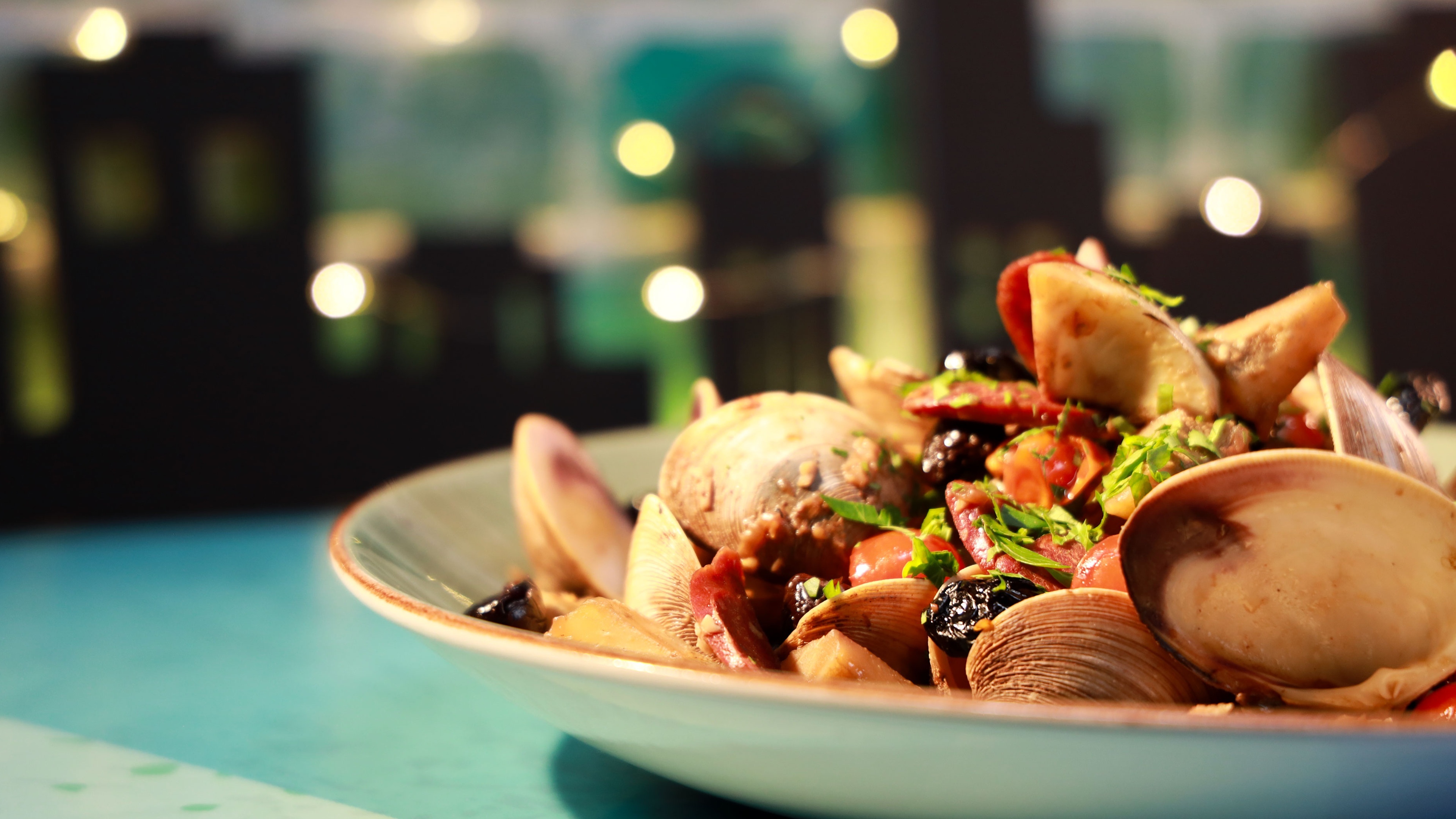 Almejas, risotto, patatas y salmón